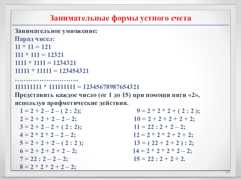 Представить каждое число (от 1 до 15) при помощи пяти «2», используя арифметические действия.