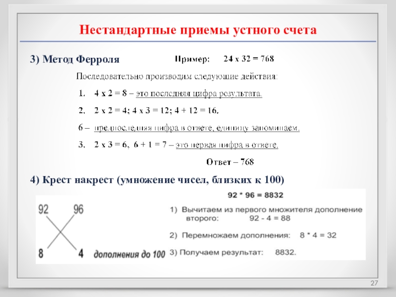 д) 43 * 25 = (43 : 4 = 10 и 3-остаток) = 10 * 100 + 3 * 25 = 1075;