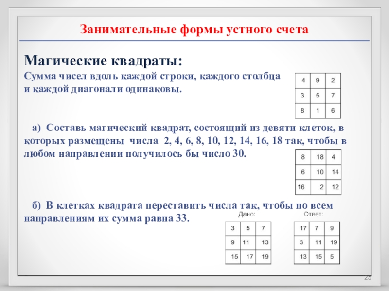 б) В клетках квадрата переставить числа так, чтобы по всем направлениям их сумма равна 33.