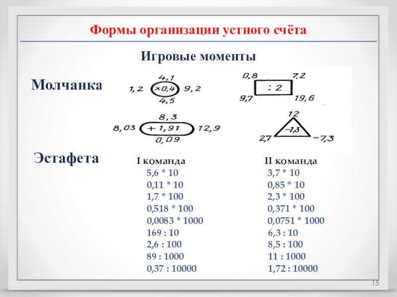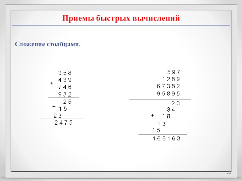 (212 + 134) – (112 + 34); 25 + 37 – 5; 1,1 * 15;