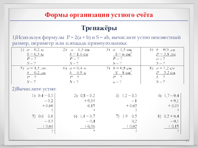 S = аb, вычислите устно неизвестный размер, периметр или площадь прямоугольника: