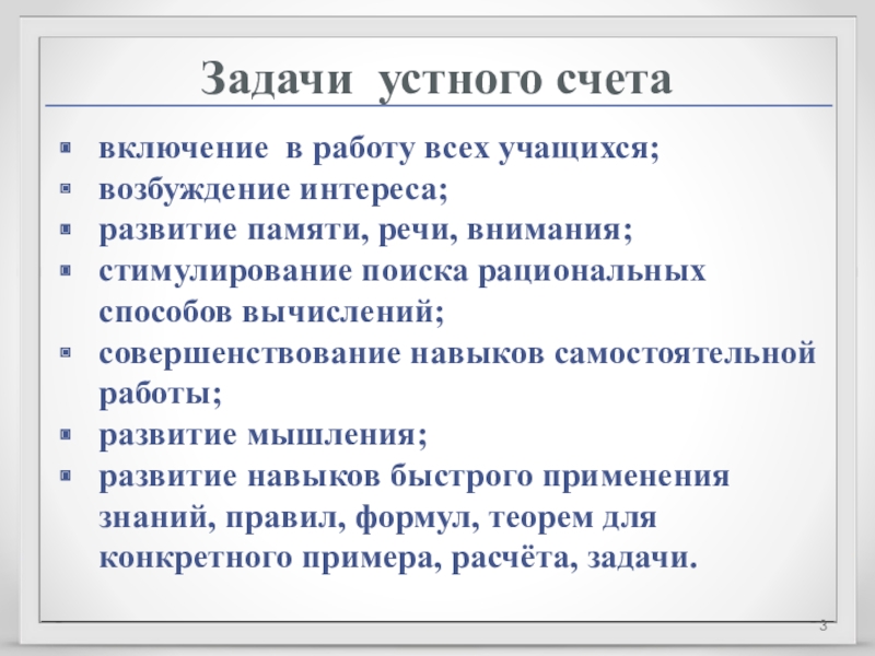 развитие навыков быстрого применения знаний, правил, формул, теорем для конкретного примера, расчёта, задачи.