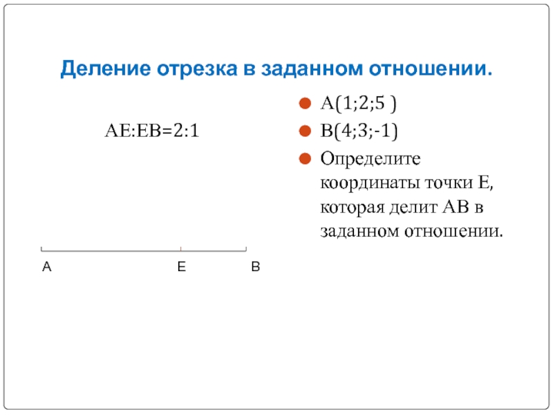 Определите координаты точки Е, которая делит АВ в заданном отношении.