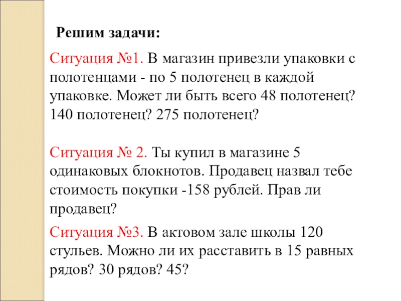 Ситуация №3. В актовом зале школы 120 стульев. Можно ли их расставить в 15 равных рядов? 30 рядов? 45?