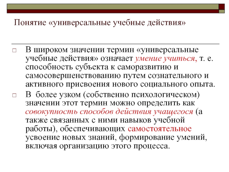 В более узком (собственно психологическом) значении этот термин можно определить как совокупность способов действия учащегося (а также связанных с ними навыков учебной работы), обеспечивающих самостоятельное усвоение новых знаний, формирование умений, включая организацию этого процесса.