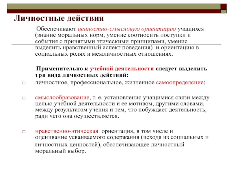 Применительно к учебной деятельности следует выделить три вида личностных действий: