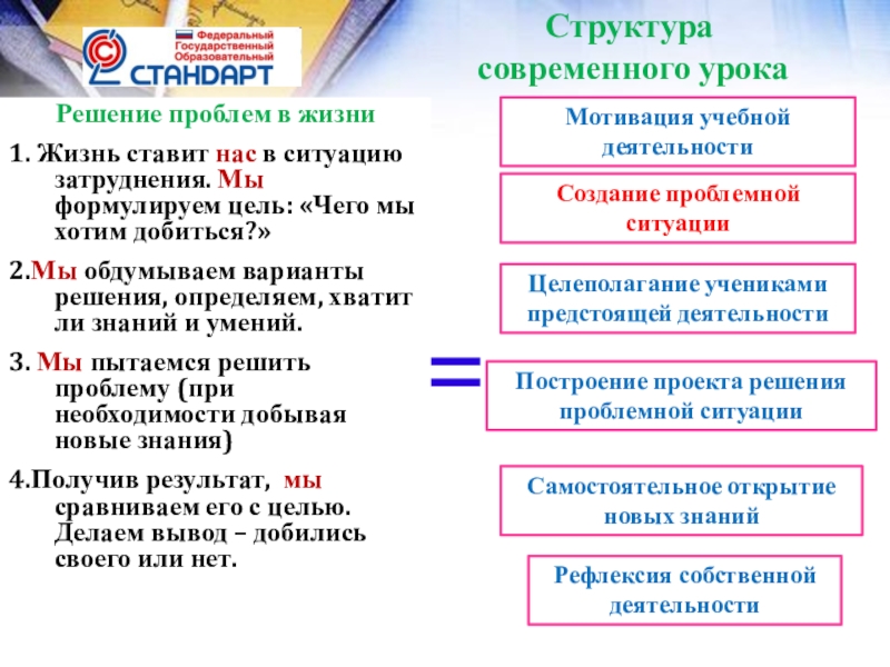 1. Жизнь ставит нас в ситуацию затруднения. Мы формулируем цель: «Чего мы хотим добиться?»