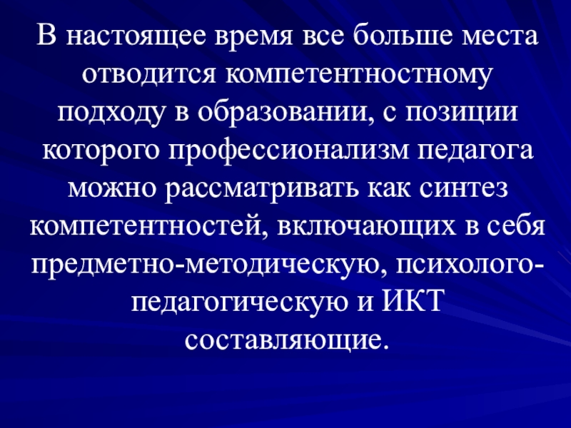 с позиции которого профессионализм педагога можно рассматривать как синтез компетентностей, включающих в себя предметно-методическую, психолого-педагогическую и ИКТ составляющие.