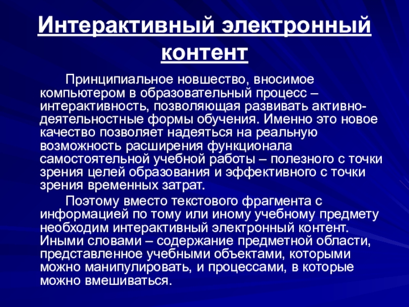 Поэтому вместо текстового фрагмента с информацией по тому или иному учебному предмету необходим интерактивный электронный контент. Иными словами – содержание предметной области, представленное учебными объектами, которыми можно манипулировать, и процессами, в которые можно вмешиваться.
