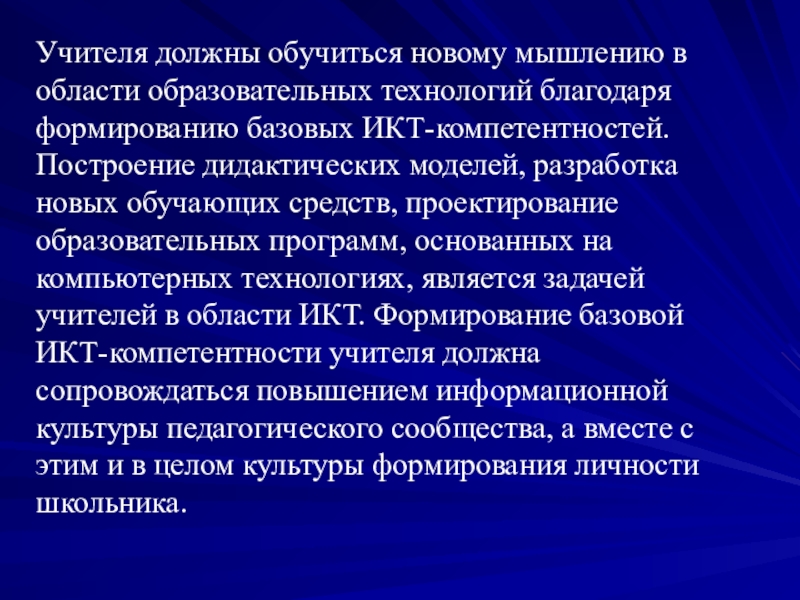 базовых ИКТ-компетентностей. Построение дидактических моделей, разработка новых обучающих средств, проектирование образовательных программ, основанных на компьютерных технологиях, является задачей учителей в области ИКТ. Формирование базовой ИКТ-компетентности учителя должна сопровождаться повышением информационной культуры педагогического сообщества, а вместе с этим и в целом культуры формирования личности школьника.