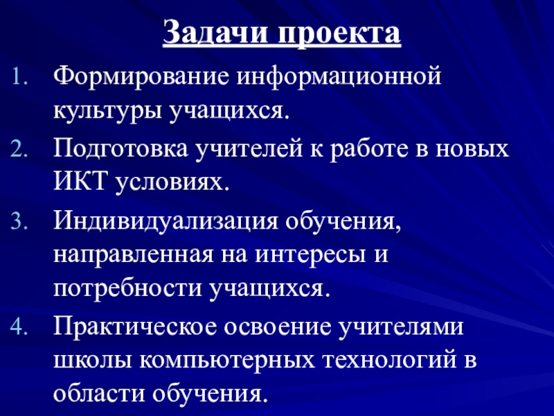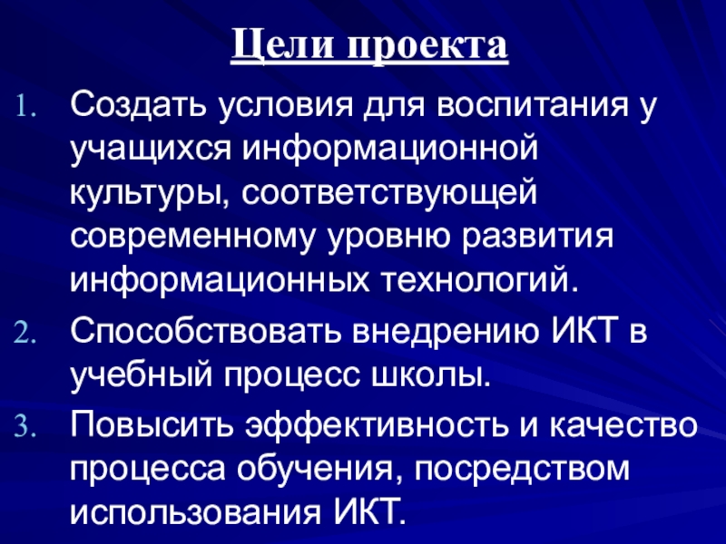 Повысить эффективность и качество процесса обучения, посредством использования ИКТ.
