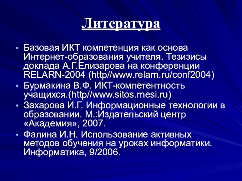 Захарова И.Г. Информационные технологии в образовании. М.:Издательский центр «Академия», 2007.