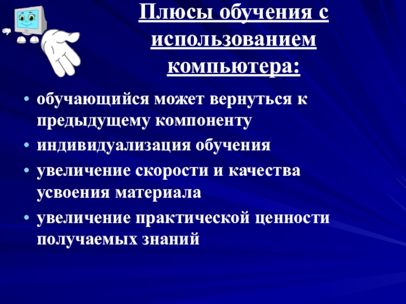 Слайд 19Плюсы обучения с использованием компьютера: