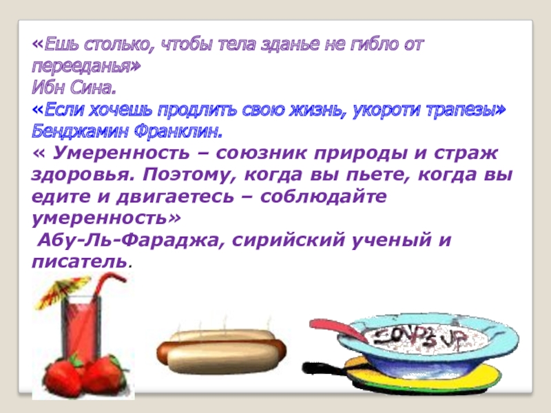 « Умеренность – союзник природы и страж здоровья. Поэтому, когда вы пьете, когда вы едите и двигаетесь – соблюдайте умеренность»