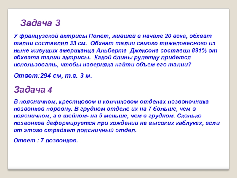 составлял 33 см. Обхват талии самого тяжеловесного из ныне живущих американца Альберта Джексона составил 891% от обхвата талии актрисы. Какой длины рулетку придется использовать, чтобы наверняка найти объем его талии?
