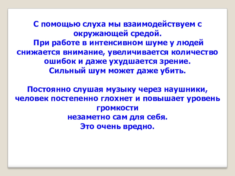 Слайд 24С помощью слуха мы взаимодействуем с окружающей средой.