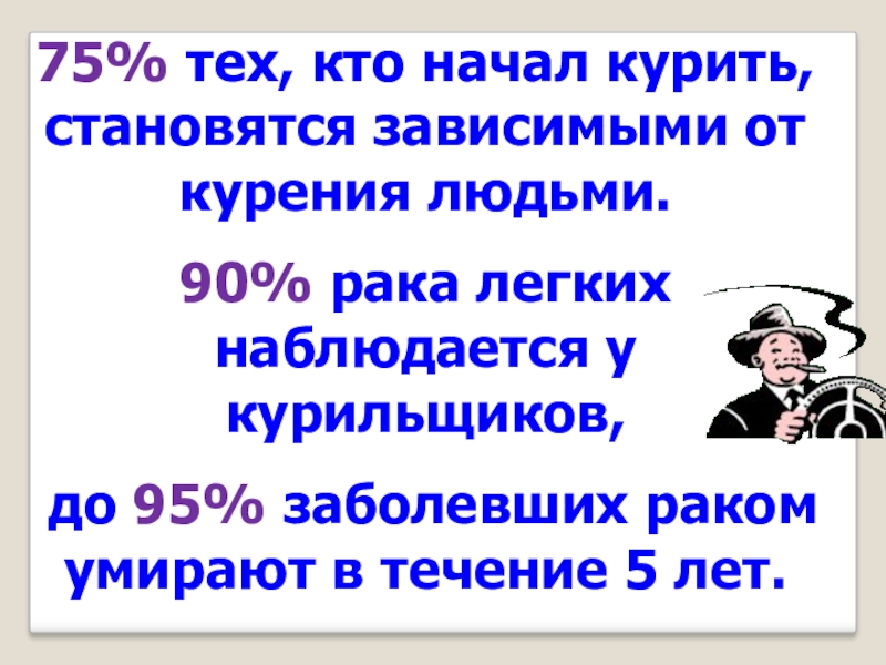 Слайд 975% тех, кто начал курить, становятся зависимыми от курения людьми.