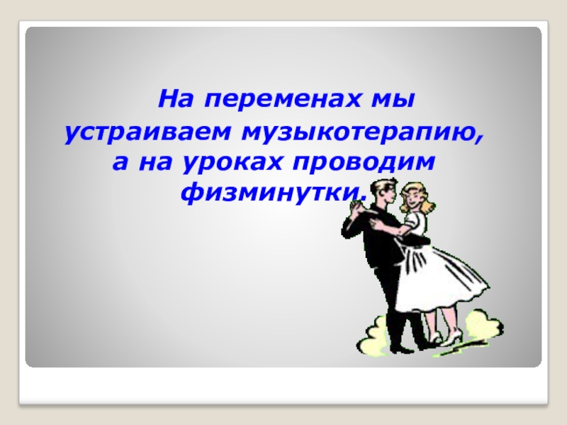 Слайд 30 На переменах мы устраиваем музыкотерапию, а на уроках проводим