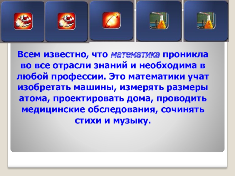 Слайд 5Всем известно, что математика проникла во все отрасли знаний и необходима