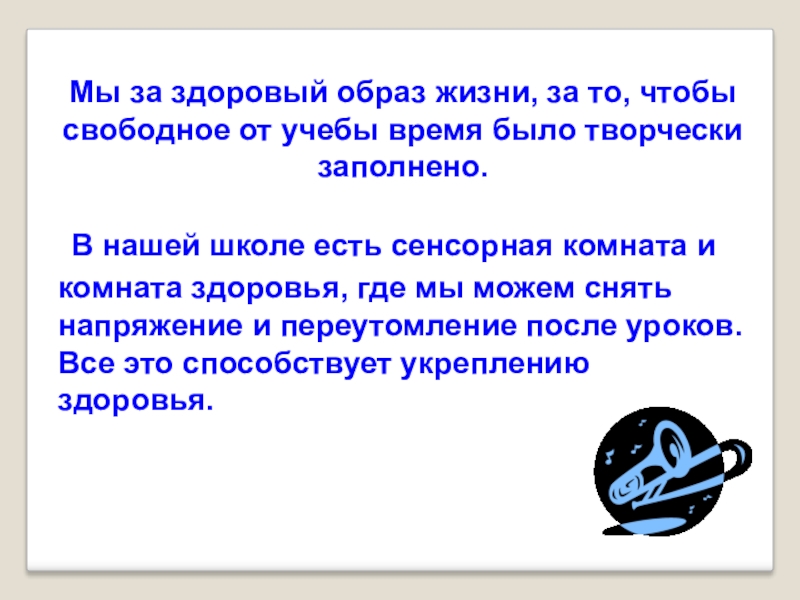 В нашей школе есть сенсорная комната и комната здоровья, где мы можем снять напряжение и переутомление после уроков. Все это способствует укреплению здоровья.