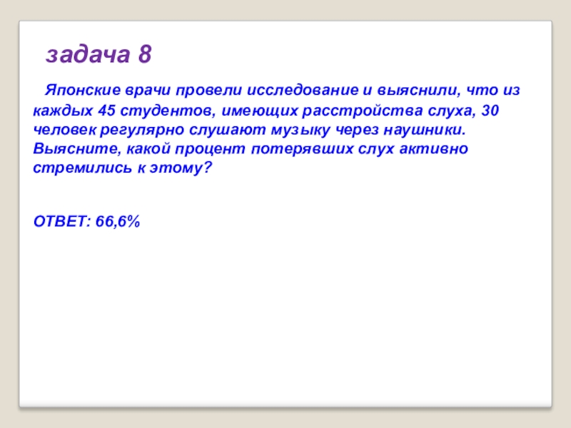 45 студентов, имеющих расстройства слуха, 30 человек регулярно слушают музыку через наушники. Выясните, какой процент потерявших слух активно стремились к этому?