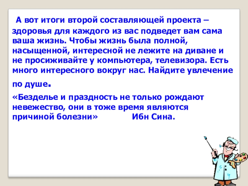 «Безделье и праздность не только рождают невежество, они в тоже время являются причиной болезни» Ибн Сина.