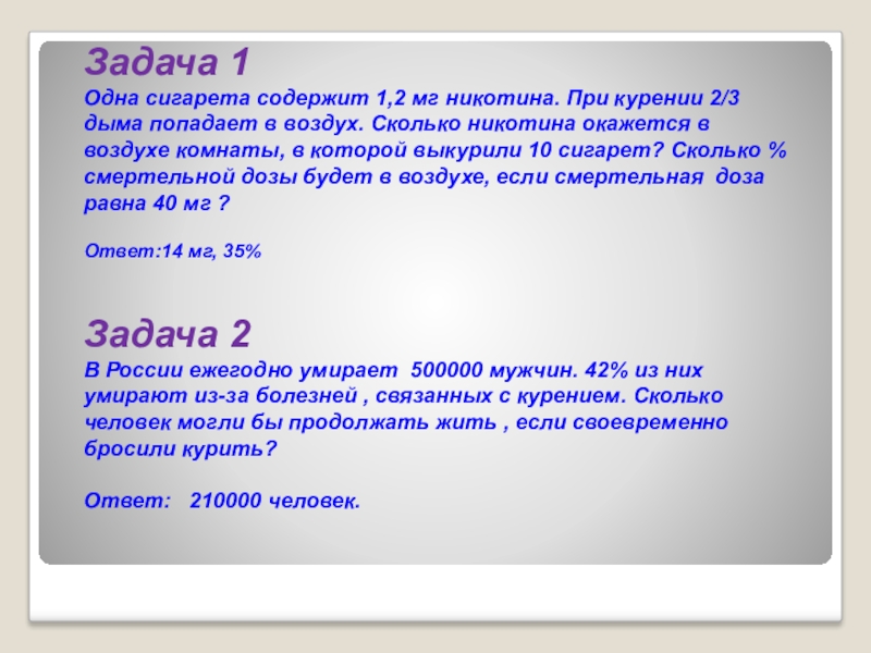 никотина. При курении 2/3 дыма попадает в воздух. Сколько никотина окажется в воздухе комнаты, в которой выкурили 10 сигарет? Сколько % смертельной дозы будет в воздухе, если смертельная доза равна 40 мг ?