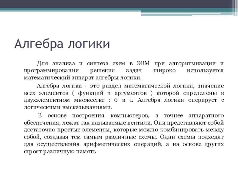 Алгебра логики - это раздел математической логики, значение всех элементов ( функций и аргументов ) которой определены в двухэлементном множестве : 0 и 1. Алгебра логики оперирует с логическими высказываниями.