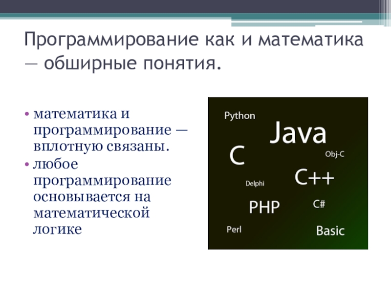 Слайд 12Программирование как и математика — обширные понятия.