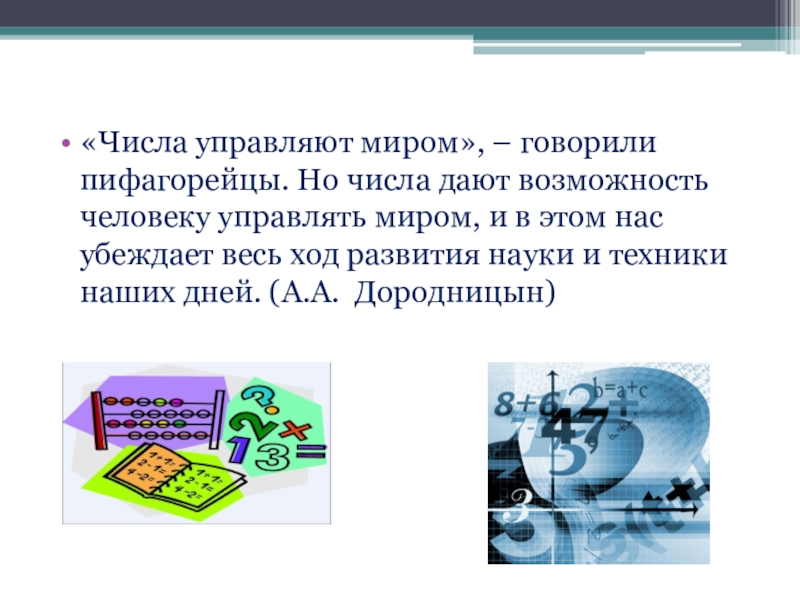 Слайд 21«Числа управляют миром», – говорили пифагорейцы. Но числа дают возможность человеку
