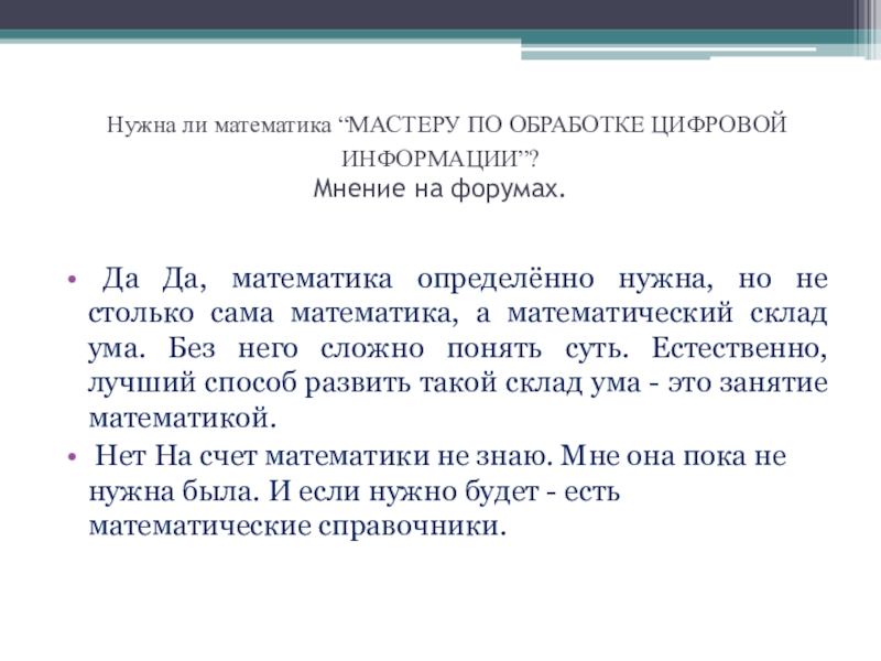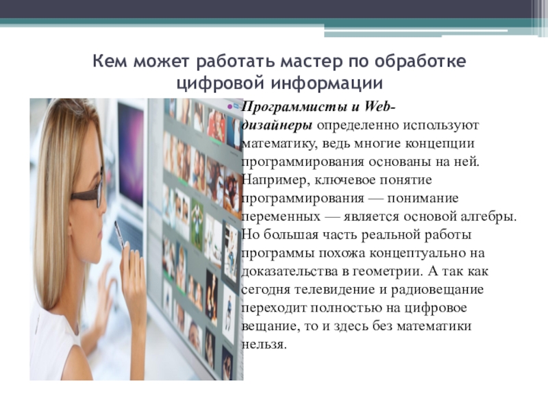 Слайд 11 Нужна ли математика “МАСТЕРУ ПО ОБРАБОТКЕ ЦИФРОВОЙ ИНФОРМАЦИИ”?