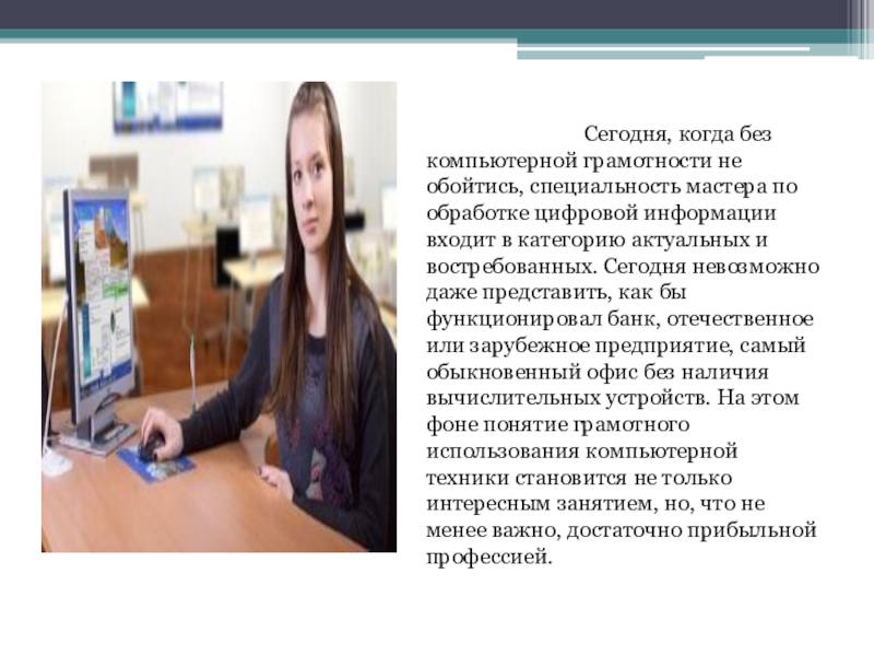 Сегодня, когда без компьютерной грамотности не обойтись, специальность мастера по обработке цифровой информации входит в категорию актуальных и востребованных. Сегодня невозможно даже представить, как бы функционировал банк, отечественное или зарубежное предприятие, самый обыкновенный офис без наличия вычислительных устройств. На этом фоне понятие грамотного использования компьютерной техники становится не только интересным занятием, но, что не менее важно, достаточно прибыльной профессией.
