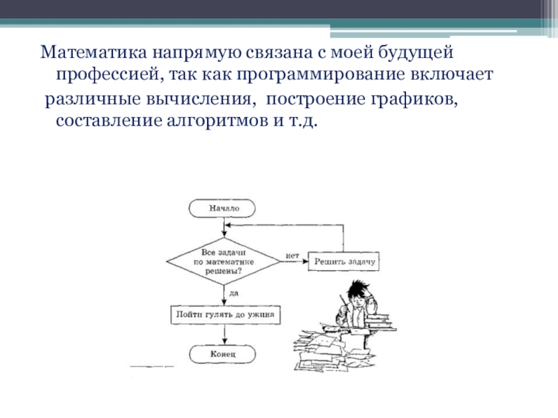 Слайд 14Математика напрямую связана с моей будущей профессией, так как программирование включает