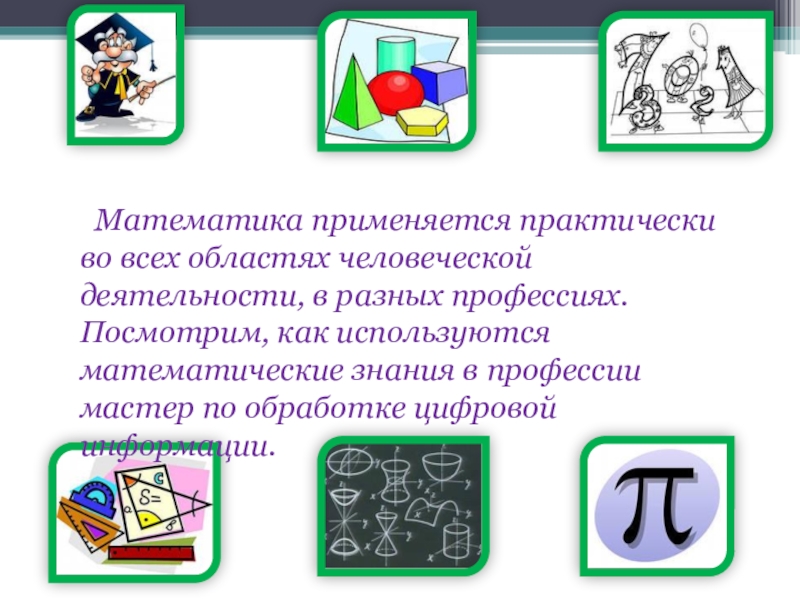 в разных профессиях. Посмотрим, как используются математические знания в профессии мастер по обработке цифровой информации.