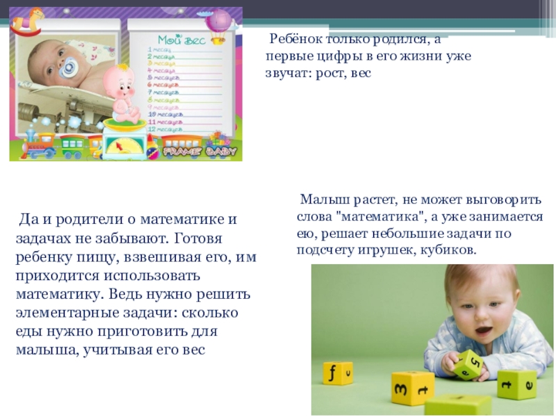 пищу, взвешивая его, им приходится использовать математику. Ведь нужно решить элементарные задачи: сколько еды нужно приготовить для малыша, учитывая его вес