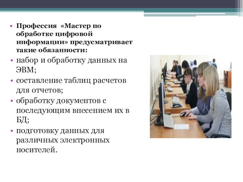 Слайд 10Профессия «Мастер по обработке цифровой информации» предусматривает такие обязанности: