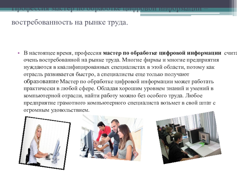настоящее время, профессия мастер по обработке цифровой информации считается очень востребованной на рынке труда. Многие фирмы и многие предприятия нуждаются в квалифицированных специалистах в этой области, потому как отрасль развивается быстро, а специалисты еще только получают образование Мастер по обработке цифровой информации может работать практически в любой сфере. Обладая хорошим уровнем знаний и умений в компьютерной отрасли, найти работу можно без особого труда. Любое предприятие грамотного компьютерного специалиста возьмет в свой штат с огромным удовольствием.