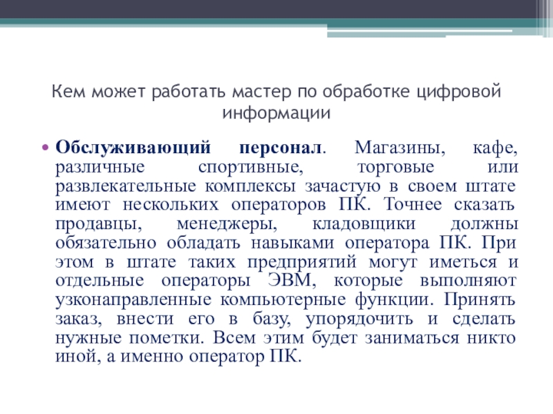 различные спортивные, торговые или развлекательные комплексы зачастую в своем штате имеют нескольких операторов ПК. Точнее сказать продавцы, менеджеры, кладовщики должны обязательно обладать навыками оператора ПК. При этом в штате таких предприятий могут иметься и отдельные операторы ЭВМ, которые выполняют узконаправленные компьютерные функции. Принять заказ, внести его в базу, упорядочить и сделать нужные пометки. Всем этим будет заниматься никто иной, а именно оператор ПК.