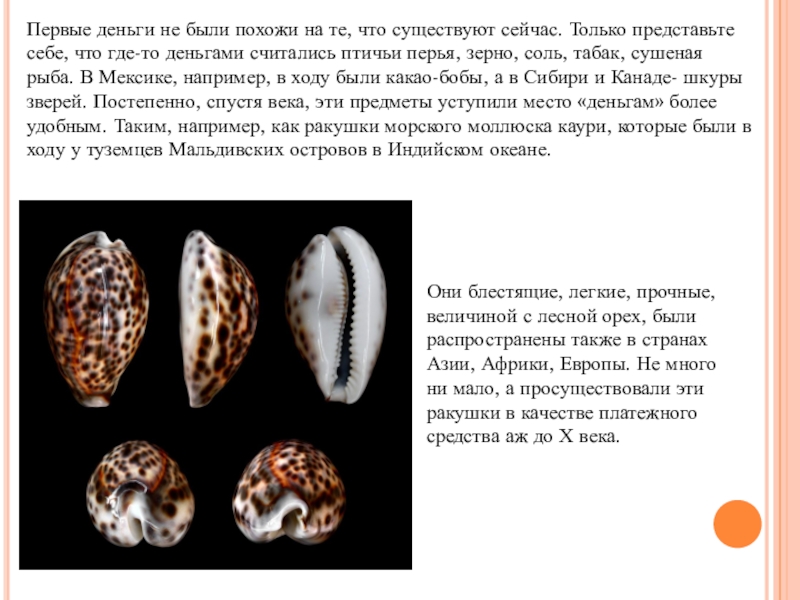 Они блестящие, легкие, прочные, величиной с лесной орех, были распространены также в странах Азии, Африки, Европы. Не много ни мало, а просуществовали эти ракушки в качестве платежного средства аж до Х века.