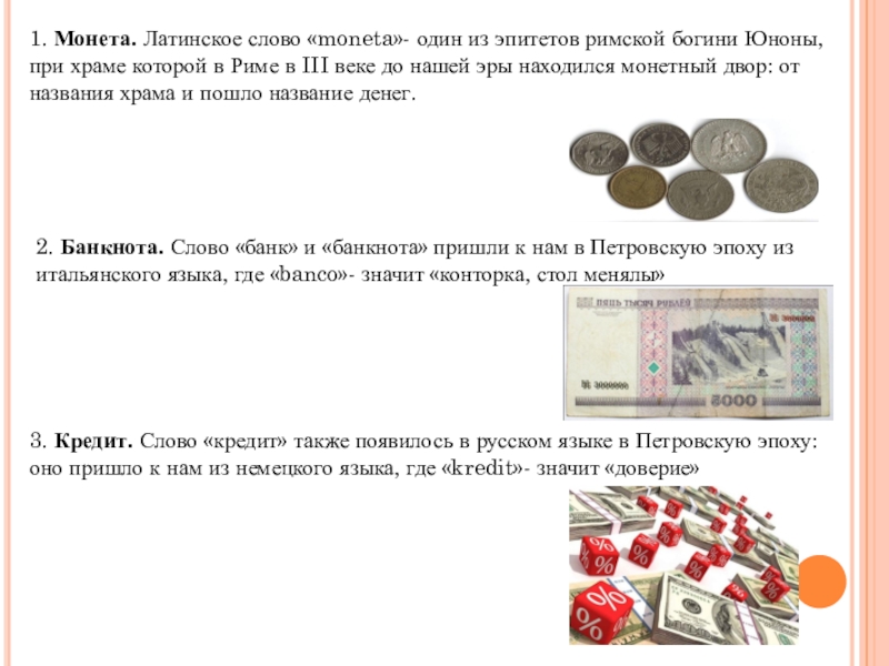 3. Кредит. Слово «кредит» также появилось в русском языке в Петровскую эпоху: оно пришло к нам из немецкого языка, где «kredit»- значит «доверие»