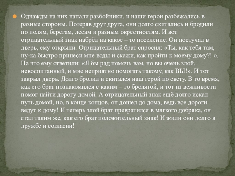 стороны. Потеряв друг друга, они долго скитались и бродили по полям, берегам, лесам и разным окрестностям. И вот отрицательный знак набрёл на какое – то поселение. Он постучал в дверь, ему открыли. Отрицательный брат спросил: «Ты, как тебя там, ну-ка быстро принеси мне воды и скажи, как пройти к моему дому?! ». На что ему ответили: «Я бы рад помочь вам, но вы очень злой, невоспитанный, и мне неприятно помогать такому, как ВЫ!». И тот закрыл дверь. Долго бродил и скитался наш герой по свету. В то время, как его брат познакомился с каким – то бродягой, и тот из вежливости помог найти дорогу домой. А отрицательный знак ещё долго искал путь домой, но, в конце концов, он дошел до дома, ведь все дороги ведут к дому! И теперь злой брат превратился в мягкого добряка, он стал таким же, как его брат положительный знак! И жили они долго в дружбе и согласии!