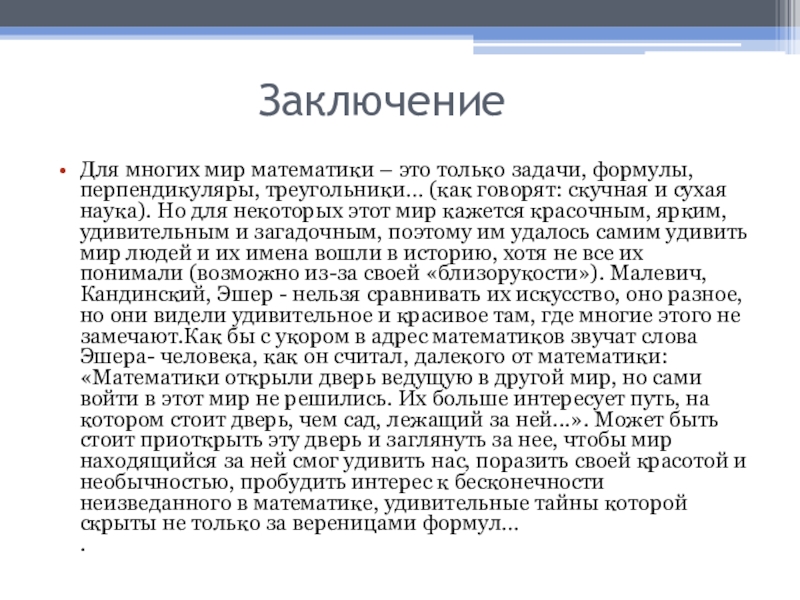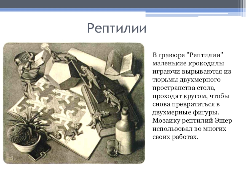 Позже в 1957 году в своем эссе о мозаиках Эшер написал:В математических работах регулярное разбиение плоскости рассматривается теоретически... Значит ли это, что данный вопрос является сугубо математическим?