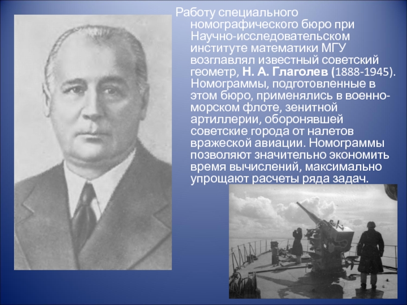 советский геометр, Н. А. Глаголев (1888-1945). Номограммы, подготовленные в этом бюро, применялись в военно-морском флоте, зенитной артиллерии, оборонявшей советские города от налетов вражеской авиации. Номограммы позволяют значительно экономить время вычислений, максимально упрощают расчеты ряда задач.