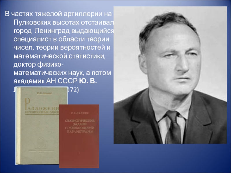 специалист в области теории чисел, теории вероятностей и математической статистики, доктор физико-математических наук, а потом академик АН СССР Ю. В. Линник (1915 - 1972)