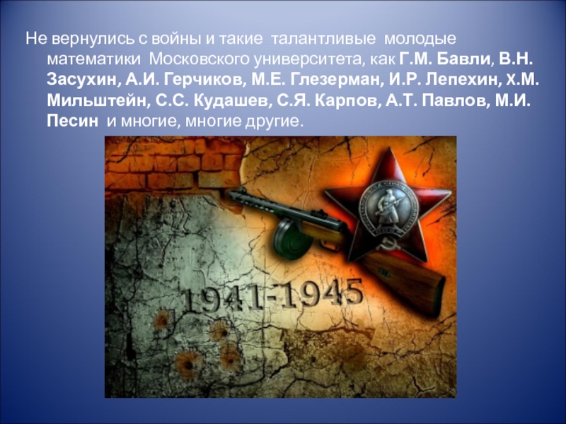 Слайд 35Не вернулись с войны и такие талантливые молодые математики Московского университета,