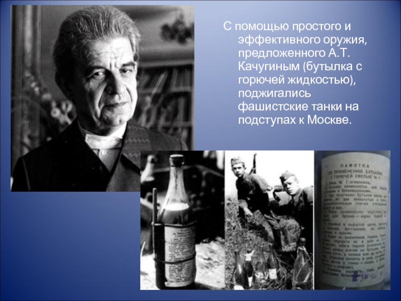 Слайд 18С помощью простого и эффективного оружия, предложенного А.Т. Качугиным (бутылка с