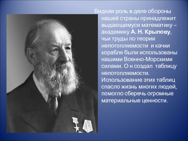 академику А. Н. Крылову, чьи труды по теории непотопляемости и качки корабля были использованы нашими Военно-Морскими силами. О н создал таблицу непотопляемости. Использование этих таблиц спасло жизнь многих людей, помогло сберечь огромные материальные ценности.