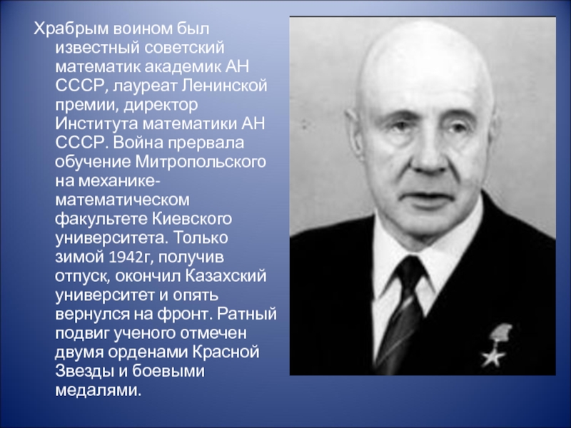 премии, директор Института математики АН СССР. Война прервала обучение Митропольского на механике- математическом факультете Киевского университета. Только зимой 1942г, получив отпуск, окончил Казахский университет и опять вернулся на фронт. Ратный подвиг ученого отмечен двумя орденами Красной Звезды и боевыми медалями.