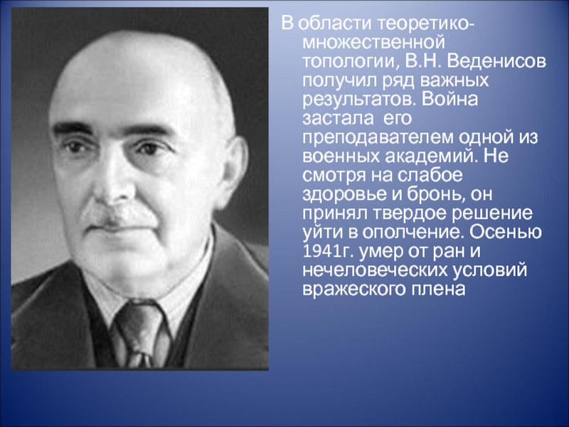 Слайд 26В области теоретико-множественной топологии, В.Н. Веденисов получил ряд важных результатов. Война