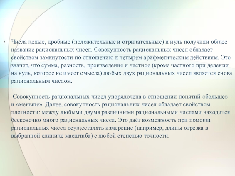 рациональных чисел. Совокупность рациональных чисел обладает свойством замкнутости по отношению к четырем арифметическим действиям. Это значит, что сумма, разность, произведение и частное (кроме частного при делении на нуль, которое не имеет смысла) любых двух рациональных чисел является снова рациональным числом.